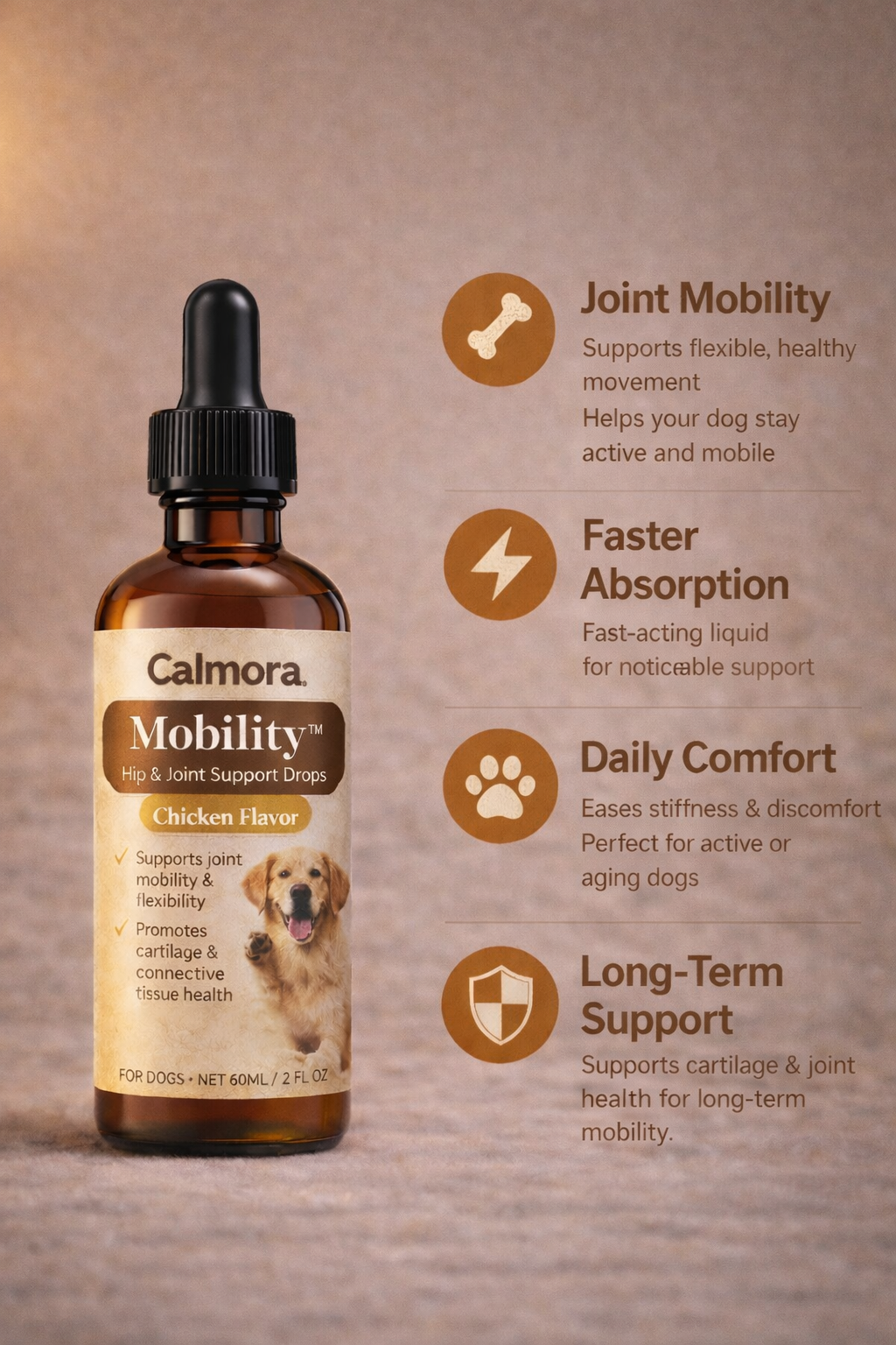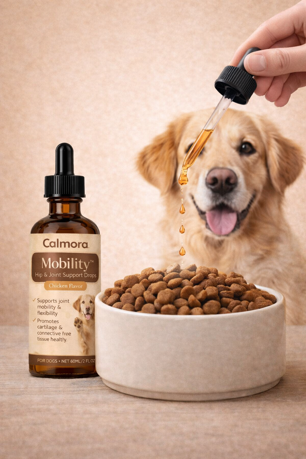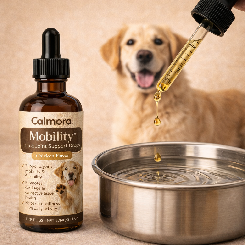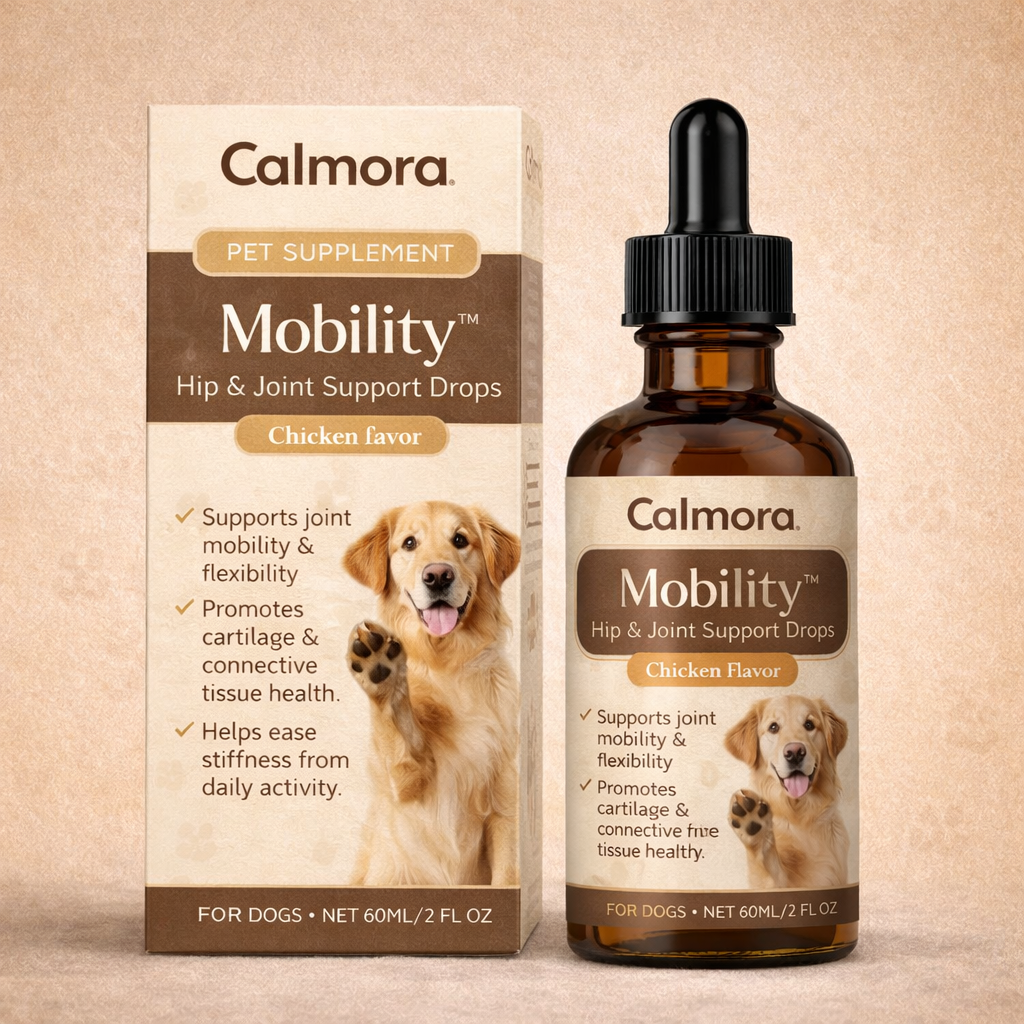 Calmora Drops are liquid wellness supplements designed to support your dog’s daily health — from relaxation and mobility to immune support.
